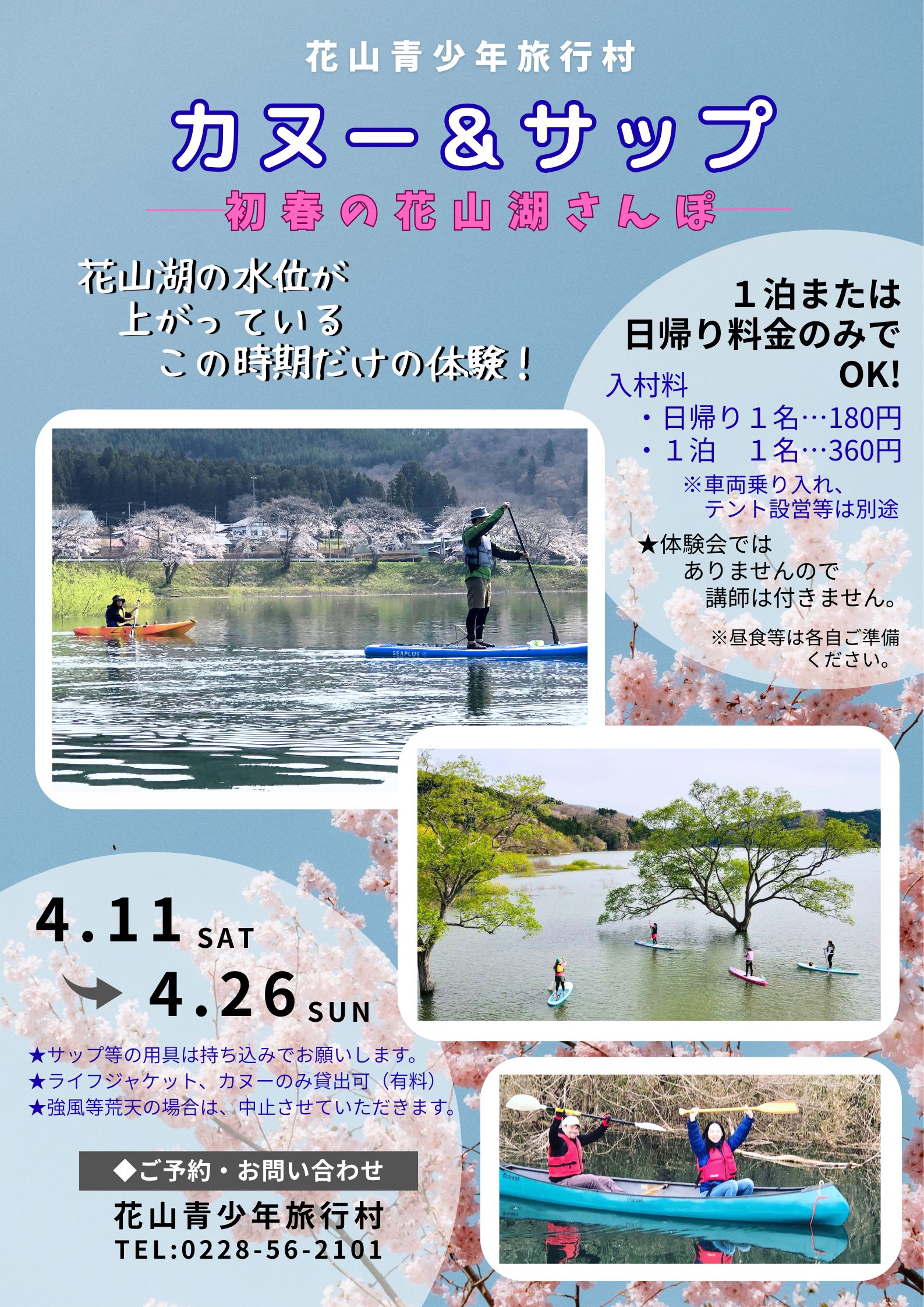 カヌー&サップで初春の花山湖さんぽ♪ 投稿公開日:2026年4月8日 投稿カテゴリー:information-announce 4月11日(土)~26日(日)実施 花山湖の水位が上がっているこの時期だけの体験です。カヌーやサップで花山湖をさんぽしてみませんか? ちょうど桜も見ごろを迎える頃の実施です。桜に囲まれた花山湖を見にどうぞお越しください。お待ちしております。 おすすめ キャンプ場は冬季も営業しております。 2023年11月10日 ラプラスボート運航は、しばらくお待ちください。 2024年5月7日 ラプラスボート再開 2024年8月13日